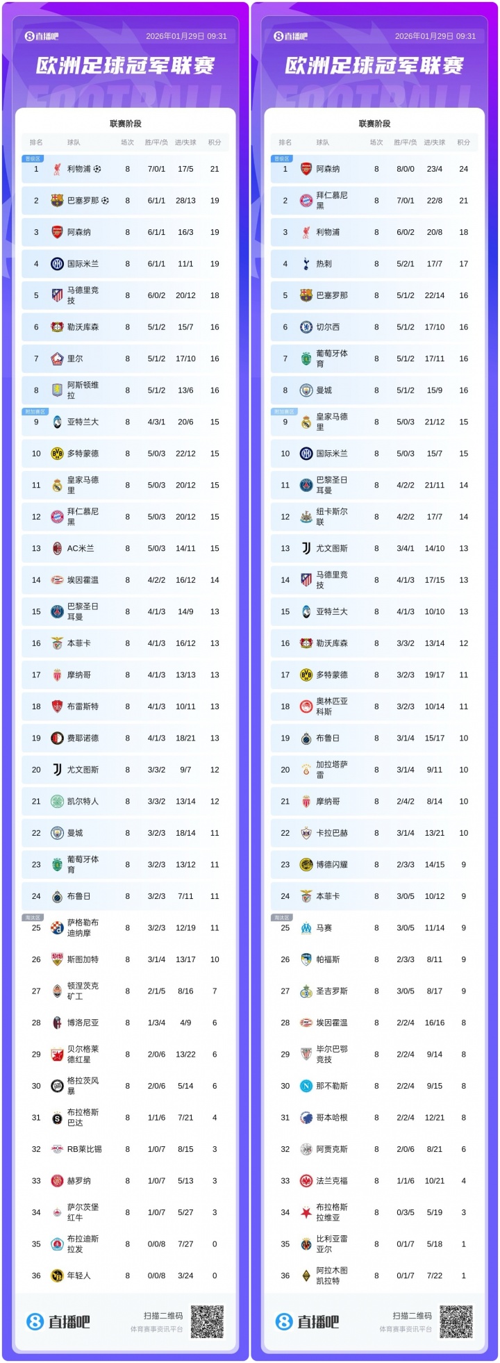 对比上赛季的欧冠职业联赛 阶段积分榜,意甲观察阿森纳、利物浦、巴萨三支球队实现了连续两年直通。