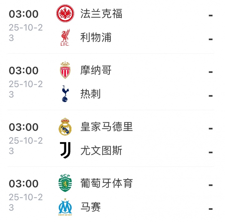 10月2日讯 欧冠第2轮赛事 全部结束,36支球队在2天内打完了18场赛事 。第3轮赛事 将在北京时间10月22日-23日凌晨进行,足坛综合站将依旧在2天内打完18场赛事 。
