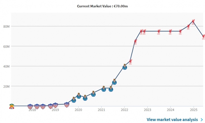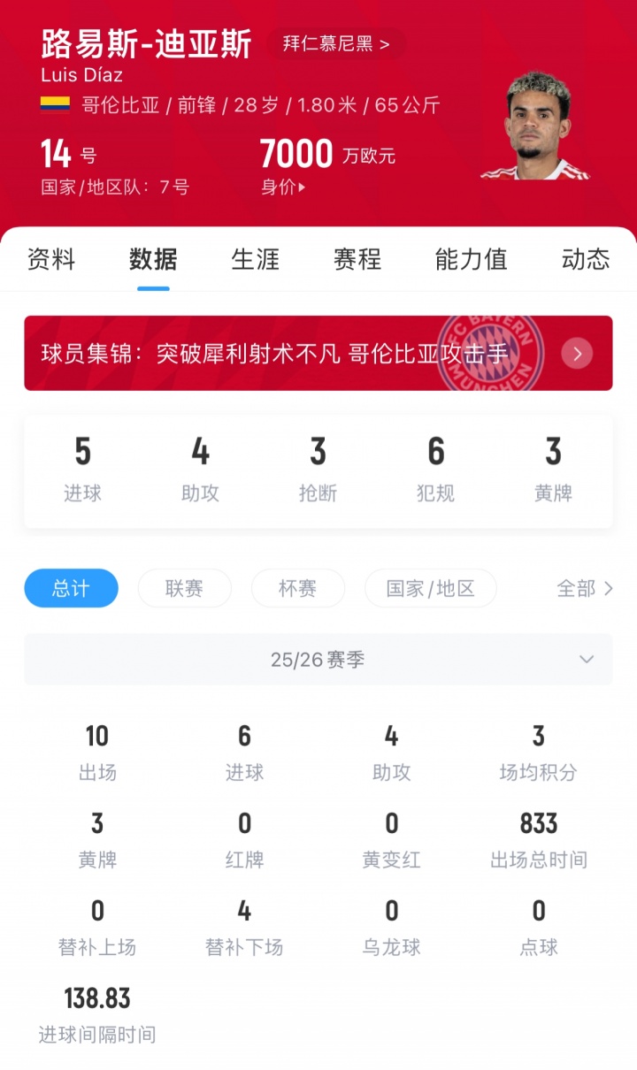 迪亚斯的巅峰期 身价为2024年的8500万欧,今年五月底,迪亚斯的身价从8500万下跌至7000万。在拜仁的完美开局并没能帮助他的身价回调。