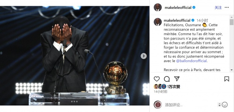 马克莱莱社媒:祝贺登贝莱,挫折与应战 铸就了你登上顶峰的决心