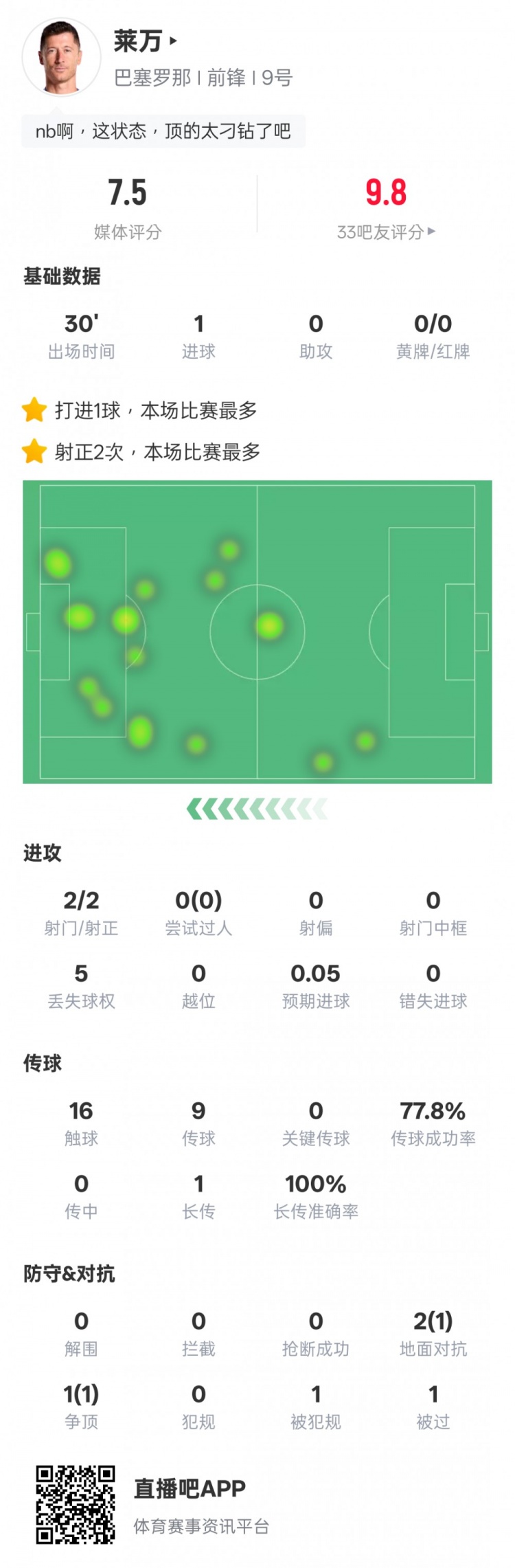 莱万本场赛事 具体数据如下: