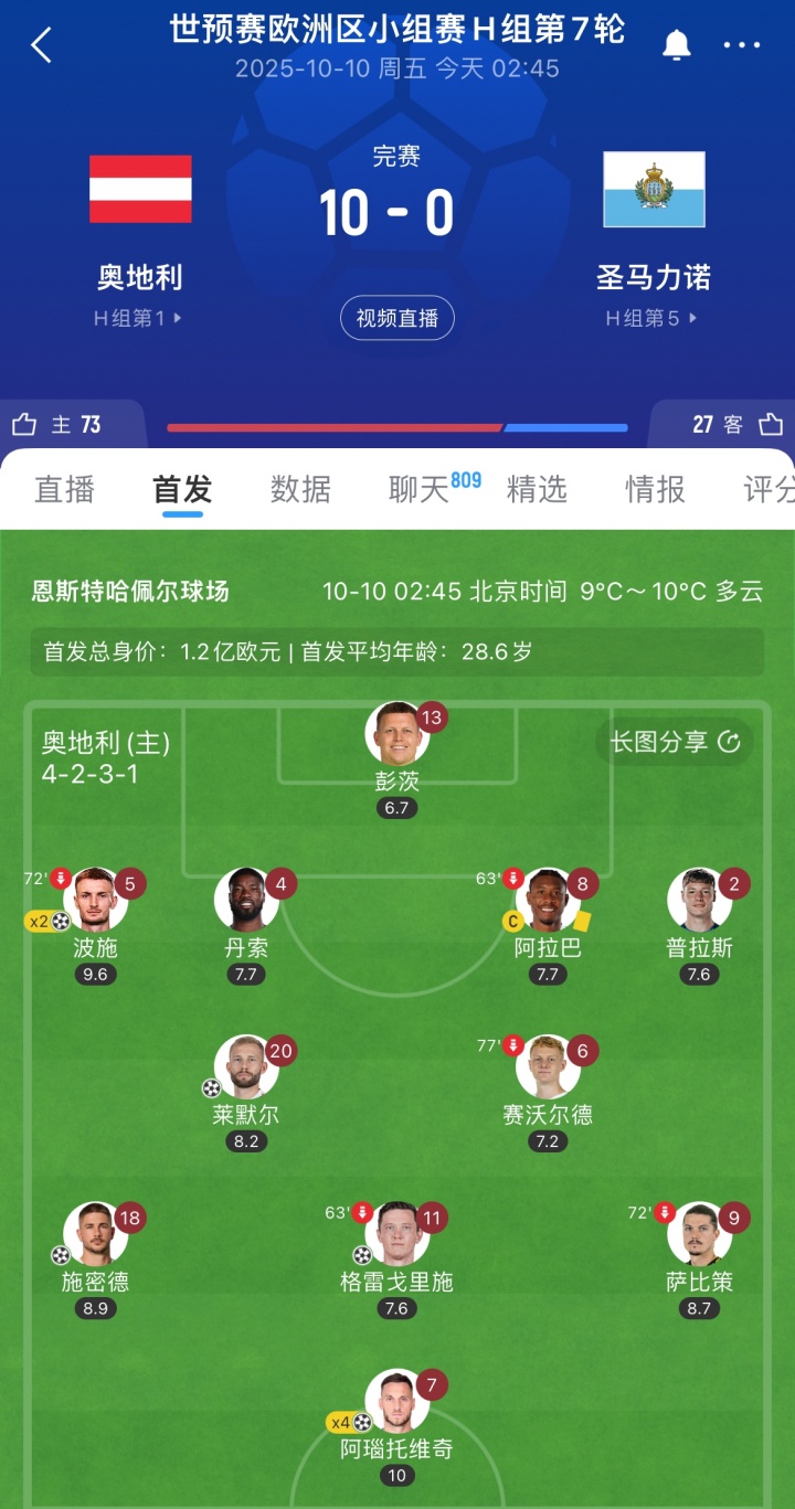 太狠了!世预赛奥地利10-0圣马力诺 杆位11人除守门员外均加入 得分