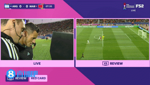 第6分钟,摩洛哥后场长传,扎比里单刀赴会挑射,被出击的阿根廷守门员巴比放倒!摩洛哥方面提出应战 !主裁去场边观看VAR,最终没有驱逐 ,向守门员巴比出示警告 ,并判决 定位球↓