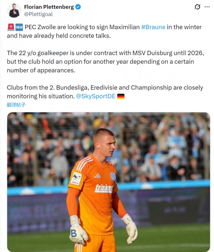 10月22日讯 据德国天空体育记者普莱滕伯格报道,荷甲俱乐部兹沃勒有意冬窗引进杜伊斯堡守门员布劳内。