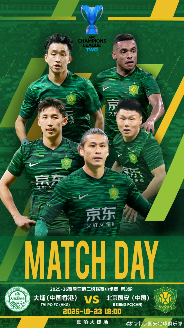 赛事预告:亚冠二级职业联赛 ,大埔vs北京国安,10月23日18:00