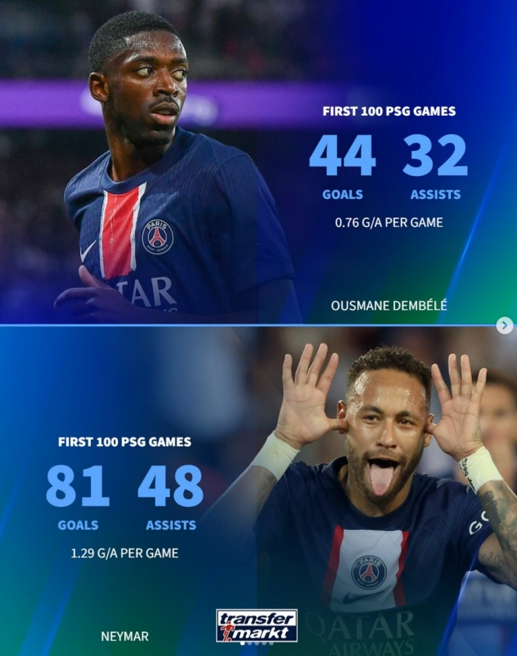 登贝莱巴黎百场44球32助,但同期效率仍低于内马尔、伊布、姆巴佩