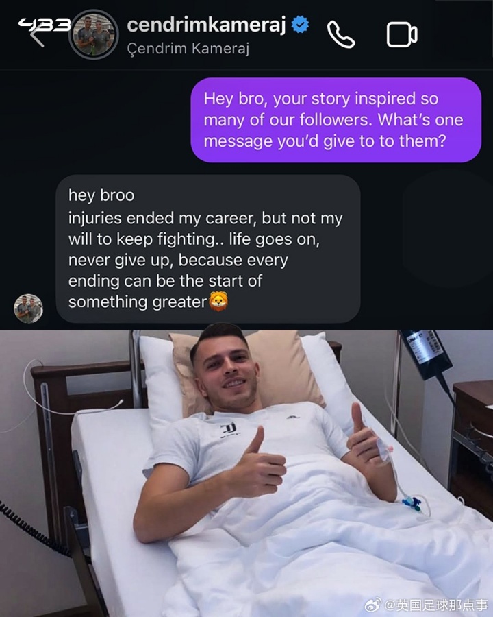 很多人被他的顽强感动,有人发私信问他有什么话想对球迷们说。他的回复——“受伤 终结了我的职业生涯,却无法终结我继续奋斗的意志。生命永不停息,绝不轻言放弃,因为每一个终点线都可能开启更伟大的征程。”