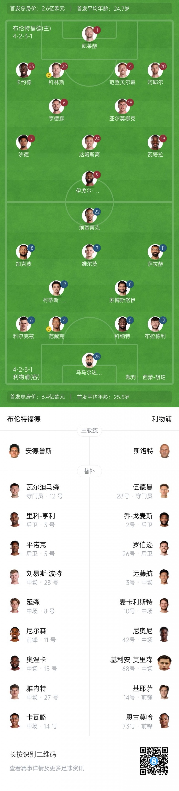 布伦特福德杆位:1-凯莱赫、20-阿耶尔、4-范登贝尔赫、22-科林斯、33-卡约德、6-亨德森、18-亚尔莫柳克、24-达姆斯高、7-沙德、19-瓦塔拉、9-伊戈尔·蒂亚戈