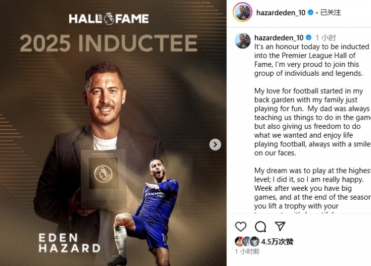 进英超名人堂!阿扎尔:奖杯也属于队友和指导教练员,你们是我的全世界