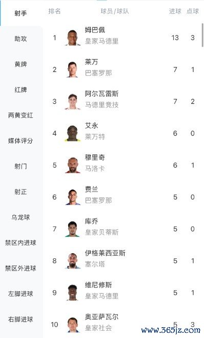 姆巴佩13球领跑西甲射手榜,拉什福德6次并列助功 榜榜首
