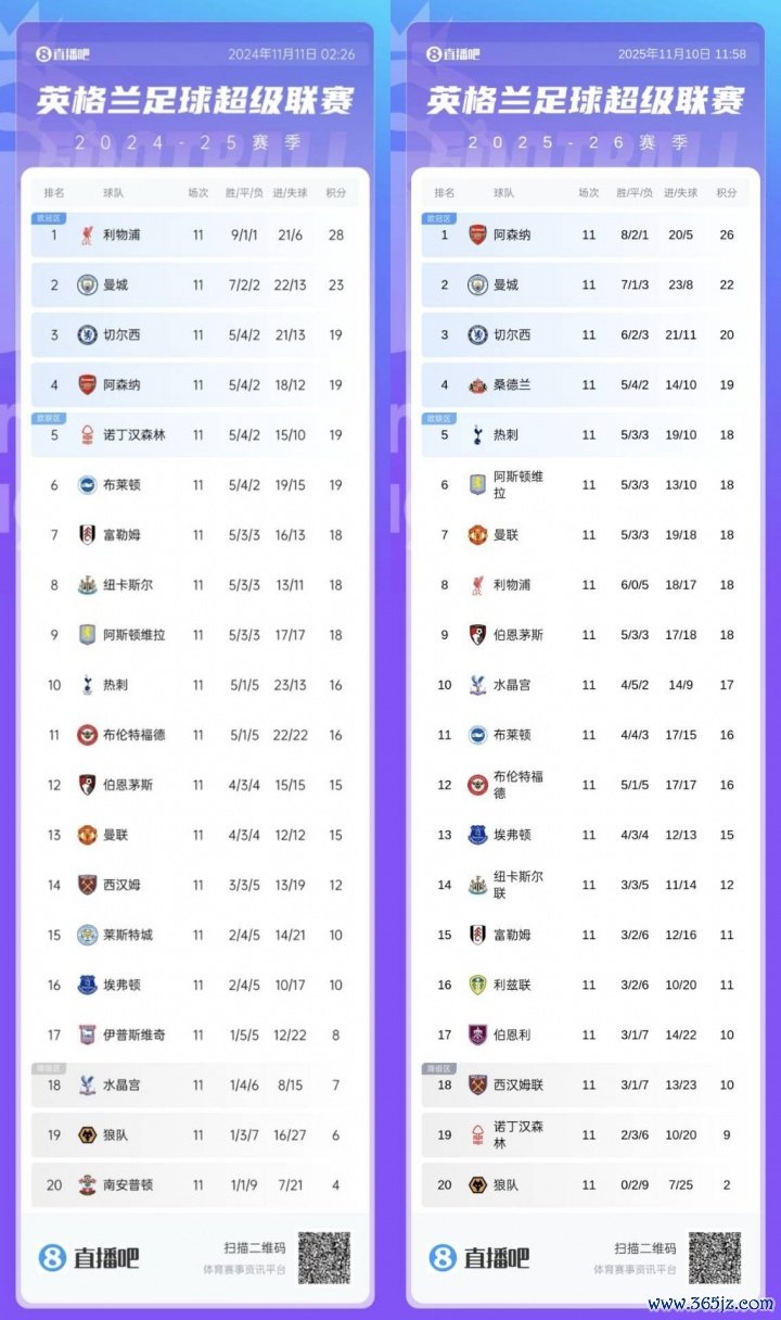 > 英超11轮对比上赛季:榜首换队二三名不变,利物浦跌7名曼联升6名